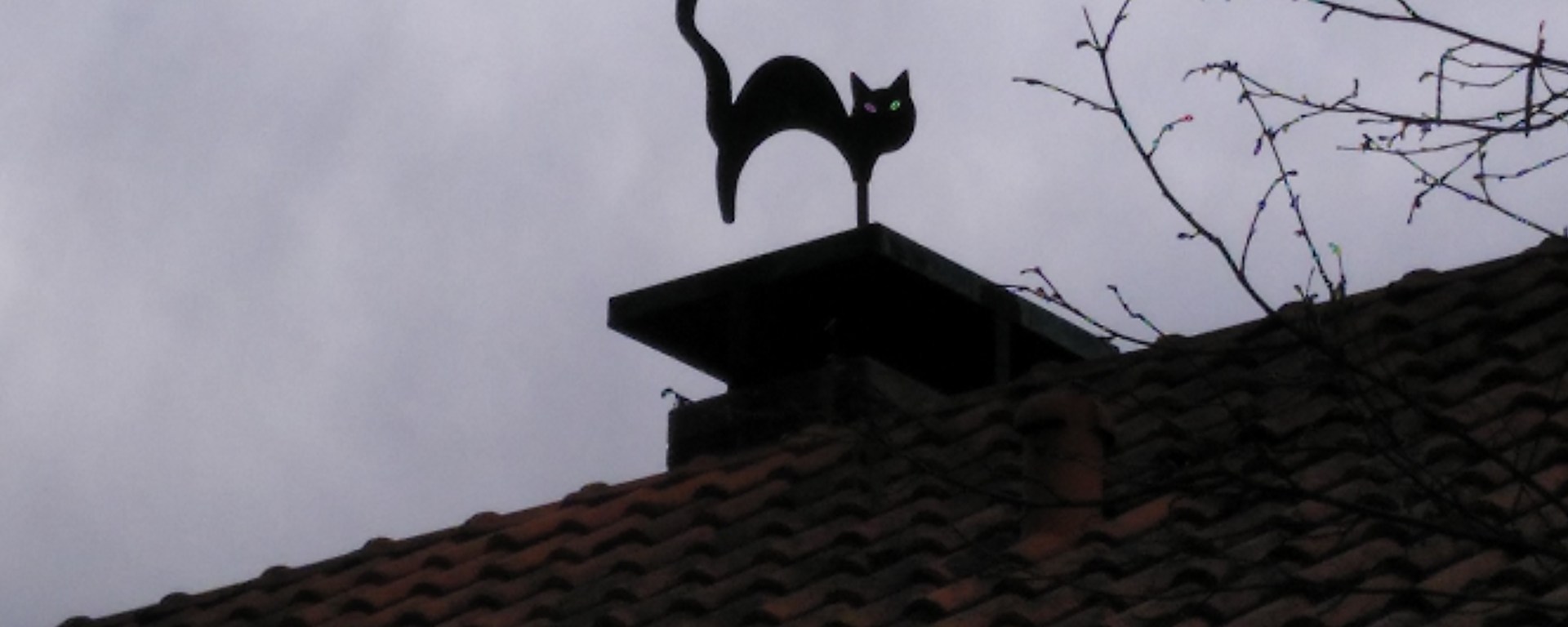 Y por último, dando una vuelta rápida con el patinete eléctrico que me compré, el cacharrito que me ayudará a moverme por las siguientes ciudades que visitemos, avisté una veleta minimalista y a la vez enigmática. En mi pueblo también. Un gato negro. ¿Quién vivirá en esa casa? Gargamel?, ¿o la bruja de Hansen y Gretel?