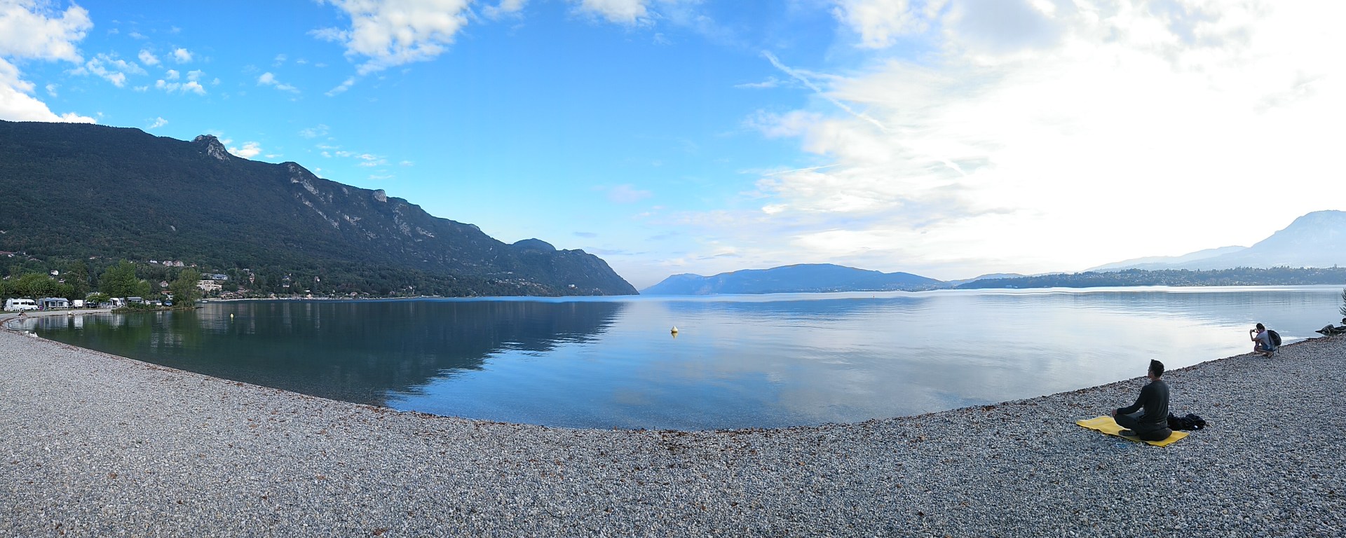 Partimos con cierta pena por dejar tan pronto Arlés para dirigirnos más al norte, a Aix les Bains, donde se encuentra el lago  de Bourget, el lago más grande de Francia, de origen glaciar. Acertamos con el camping, tal vez el más espectacular por sus vistas al lago. Nos bañamos de buena mañana como si fuera una inmensa piscina natural. Por cierto, para la vuelta compramos un colchón inflable de Decathlon que se duerme mejor que con el colchón de casa. Canelita. Y la tienda, del Decathlon también, todo un acierto, montada y desmontada en un tris, justo lo que necesitábamos.  Me sorprendió durante todas nuestras paradas a los campings, sobre cómo había cambiado el estilo campero, ahora casi todos van con autocaravanas, con sus correspondientes bicicletas, incluso motos a cuestas, con todo tipo de gadgets que hacen que te sientas como en tu casa por un precio irrisorio en campings en plena naturaleza o cerca de interesantísimas ciudades.
