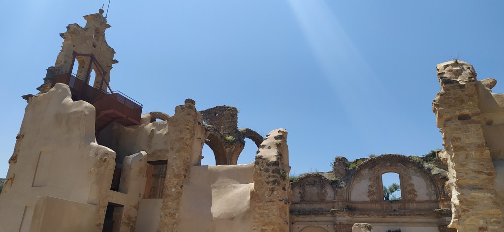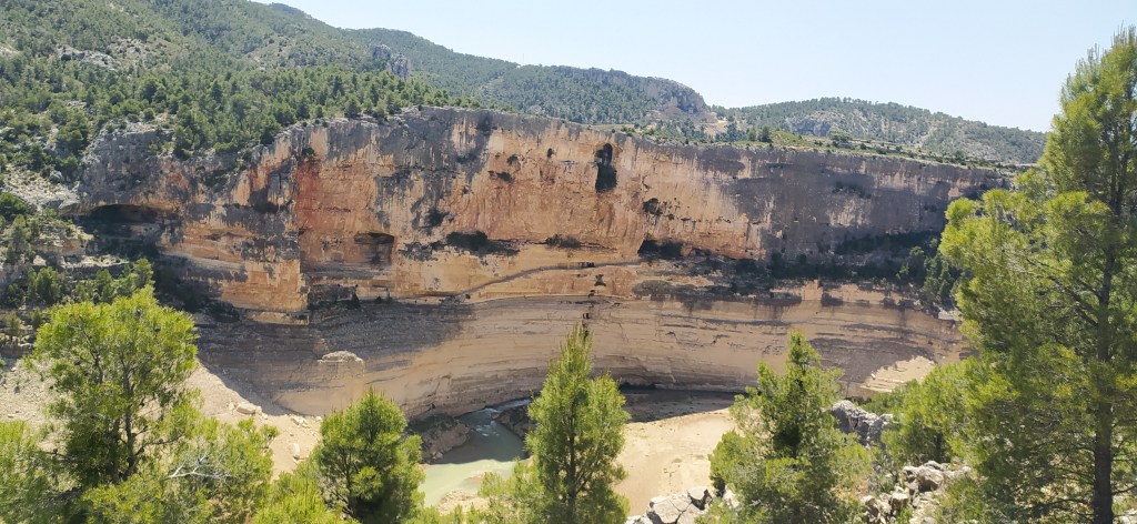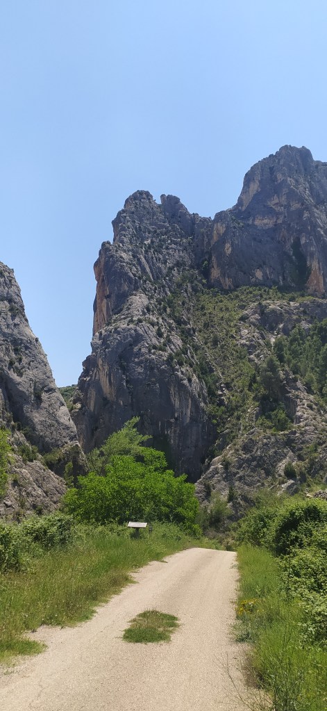 Una vez en Cuevas de Cañart, aparco y saco la bici para recorrerme le pueblo tranquilamente. Casas arregladas, otras cayéndose a cachos, casas con muro de tapia, que van deshaciéndose. Veo el antiguo lavadero, un lugar perfecto para refrescarse, me echo agua como el que se echa agua bendita. Por las laderas de la montaña cae agua por todas partes, la gran montaña que tienen detrás les abastece del preciado bien liquido. Me acerco al famoso convento que no conserva la cúpula pero mantiene la fachada y los arcos con sus santos y figuras. Muy curioso de ver de cerca. Miro en móvil después de hacer un puñado de fotos la cobertura, cobertura cero. La batería se está descargando más deprisa de lo normal. Todavía me animo a hacer una pequeña ruta por «El estrecho», siguiendo el cauce de todos aquellos riachuelos que vana parar a un enorme mazizo de piedra que se abre paso por el famoso estrecho. El agua se abrió paso por cientos de miles de años, y ahí sigue pasando. La ruta es preciosa, va bajando poco a poco. Cuando decido volver es demasiado tarde, me espera una vuelta con bastantes cuestas y un calor que empieza a apretar más y más. Cuando vuelvo al pueblo voy corriendo de nuevo al lavadero y no me meto dentro de milagro. Peor que un San Bernardo en verano. ¡Agua!, ¡agua!