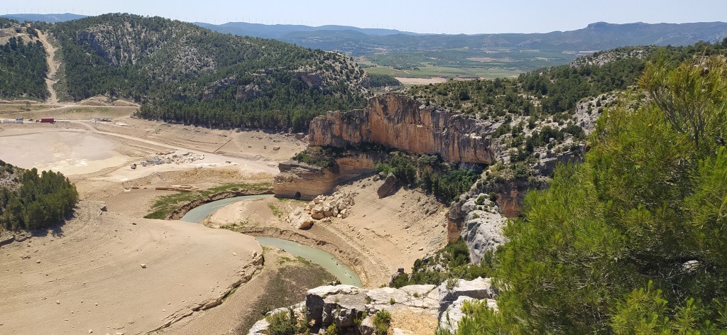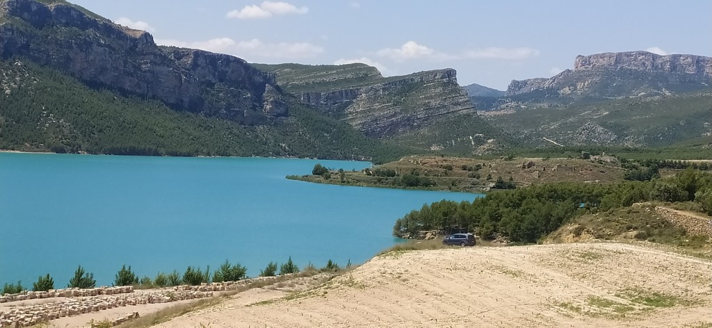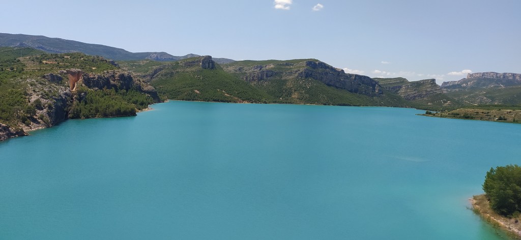 Decido ir dirección Jaganta, 12 kms de la nada. Sólo curvas y montañas encrespadas. Hasta que llego al pueblecito, lo paseo rápido, apartado, muy apartado de todo, sigo mi camino… dejo a la derecha Castellote, el cual luego visito a la vuelta y me meto por la carretera que bordea el embalse de Santolea. Vaya barrancos, ¡vaya vistas!, y vaya embalse. Después de dejar una zona más bien seca, empiezo a ver aflorar el verde de los pinos otra vez. No me encontré a nadie por el camino, sólo naturaleza. Muy chulo el camino desde el embalse a Cuevas de Cañart.